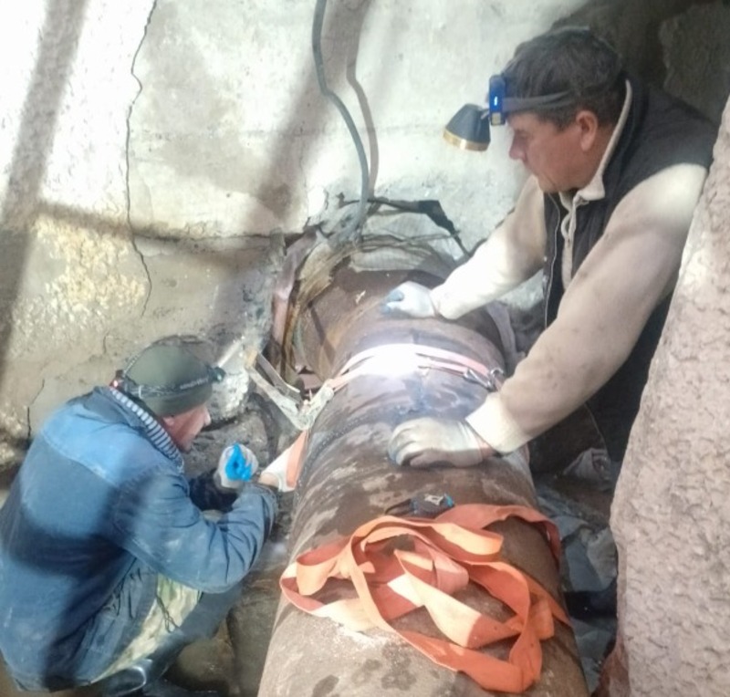 Сложность заключалась в том, что трубу прорвало у самой стены, бетонная перегородка на давала возможности крепить бандаж с двух сторон, как положено по технологии. Тогда ремонтники решили применить другой способ — наложить на место прорыва седёлко. Но, поскольку раньше это место на трубе уже неоднократно заваривали, и на её поверхности есть старые латки, седёлко не прилегало плотно, вода продолжала бить.